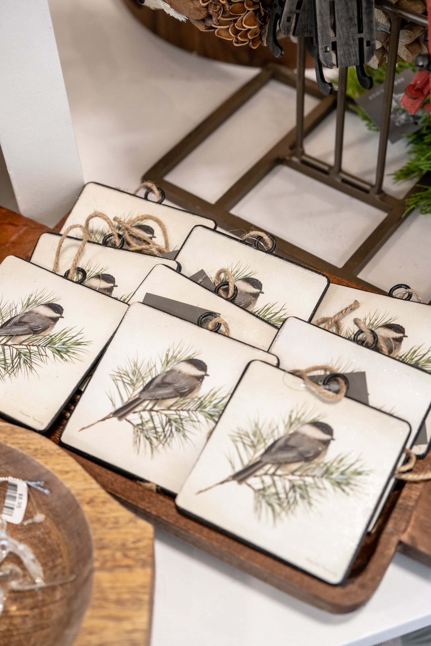 Add a touch of nature-inspired luxury to your holiday decor with our 4" Chickadee on Branch Square Ornament. Crafted from iron and jute, this elegant ornament comes in two assorted multicolor designs and features a double-sided design. Sold individually, it measures 4"L X 0.5"W X 4"H.