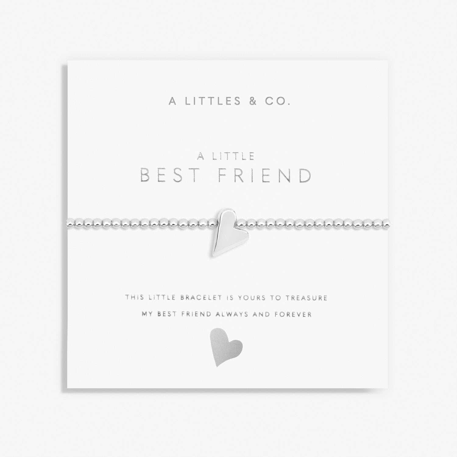 Say hello to one of the sweet sentiments in our world-famous A Little Collection! Our A Little 'Best Friend' Bracelet In Silver Plating features a captivating stretch design and a precious heart charm that hangs at an angle. Wrapped around one of our stylized cards and framed with a sweet sentiment, this piece is sure to make a standout gift and a wonderful addition to your loved one's collection.