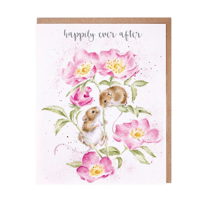 Congratulate a couple on their wedding day with this card which features two adorable mice and reads 'Happily Ever After' The card is printed on high quality, sustainably sourced textured board. It measures 6.77 x 4.84 inches and is supplied wrapped with a recycled, kraft envelope. Message inside reads 'with lots of love'.