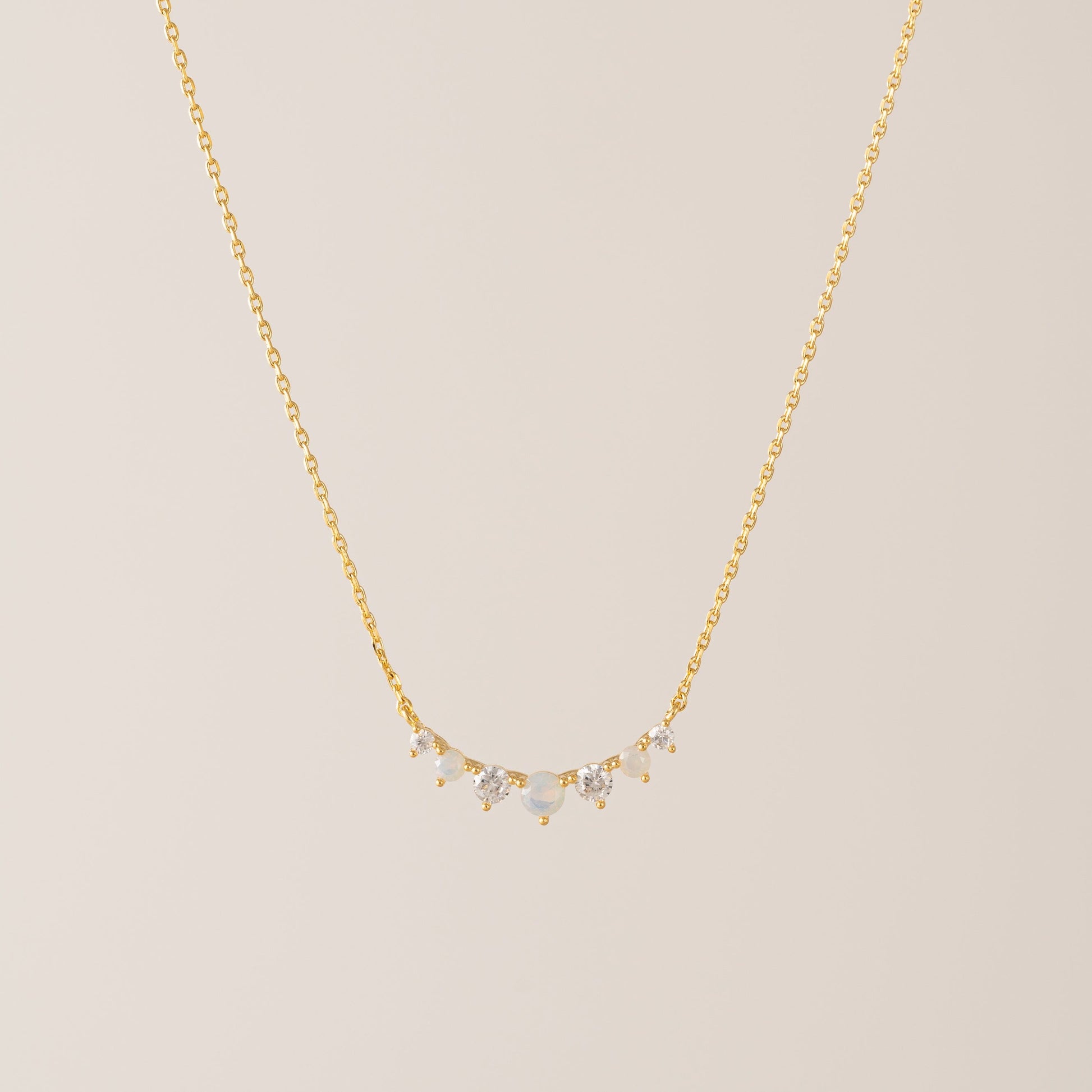 A little unexpected (in the best way). This dainty necklace features a mix of opal and clear cubic zirconias that catch the light—and compliments—without trying too hard. Made of electroplated brass with cubic zirconia, it’s dreamy, dainty, and destined to be layered.