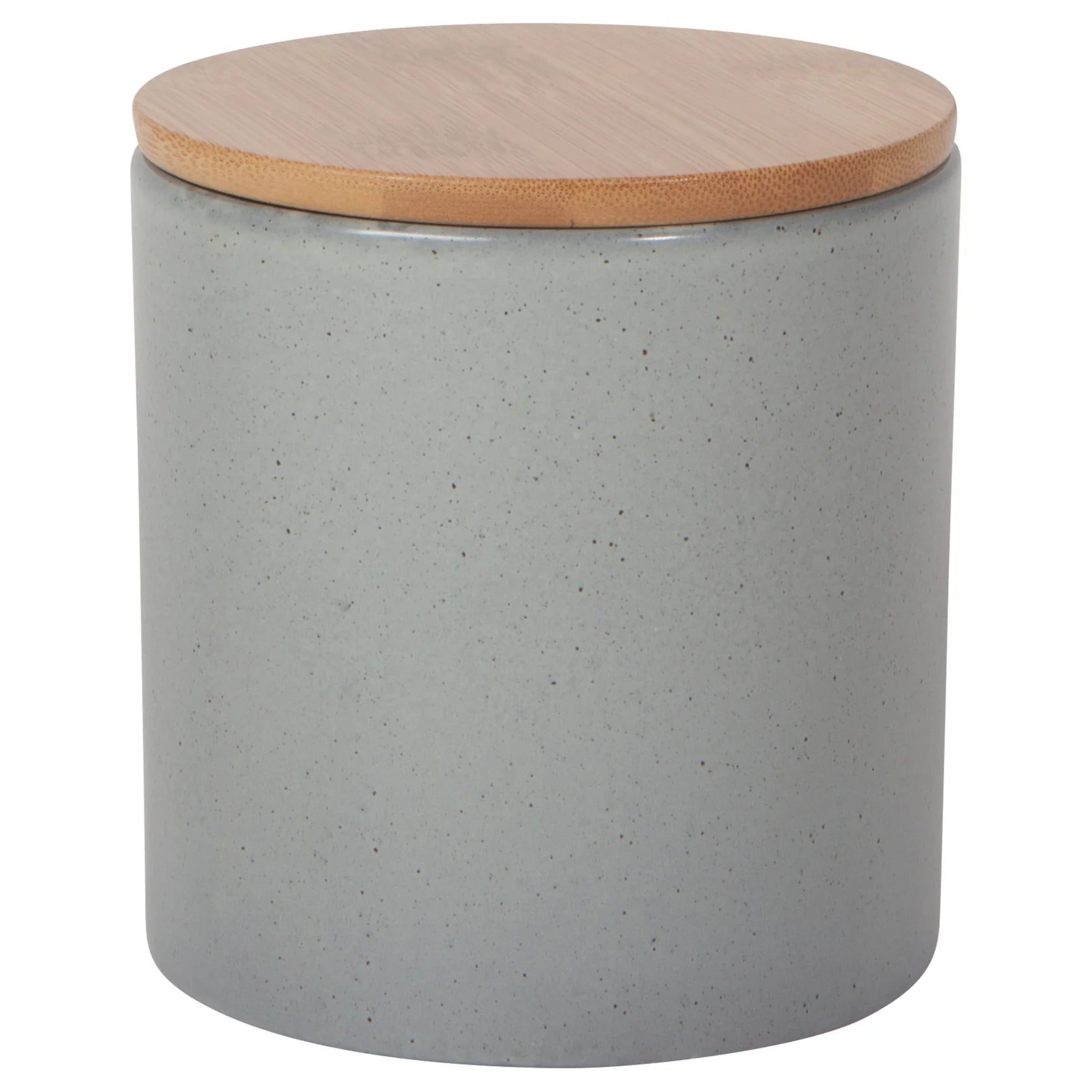 This modern storage canister features a variegated speckle surface, the result of a special reactive glaze technique. Perfect for storing dry goods in the kitchen or toieltries in the bathroom.