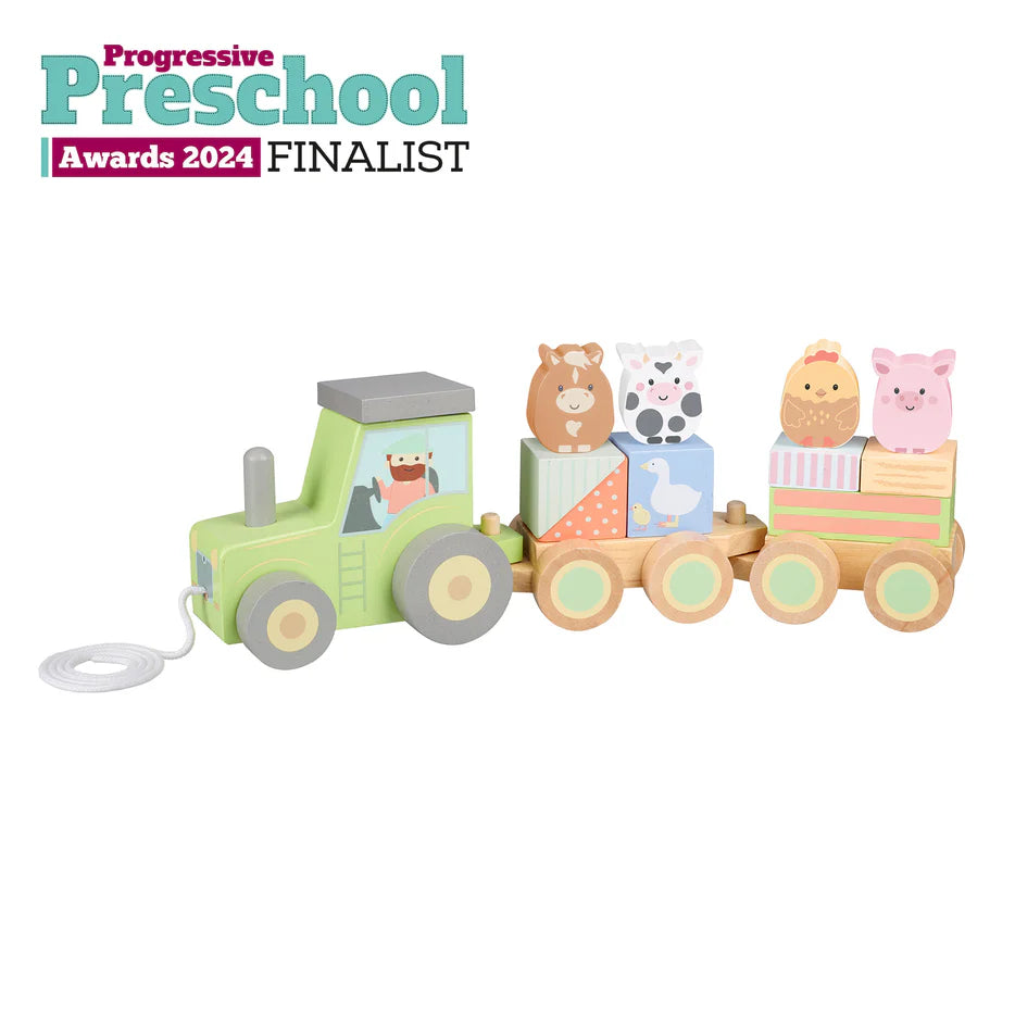 This is the perfect wooden toy for any little budding farmers! Kids will adore playing with this wooden toy tractor. The wooden tractor features a pony, cow, chicken and pig! With brightly coloured blocks, perfectly sized for little hands, the characters and carriages can be taken apart and re-built, and a handy string ensures little ones can pull their train around!