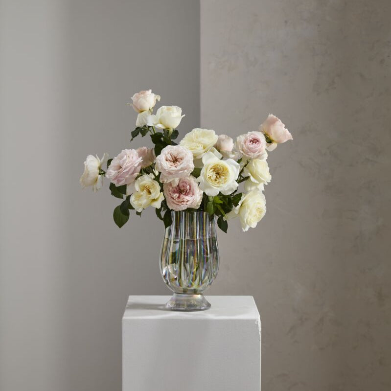 Featuring a blend of timeless glass & a modern, playful blooming flower shape, the handmade glass iridescent footed Gossamer Vase is perfect for any style of wedding & event design or everyday retail floristry. This piece also makes a beautiful orchid drop-in pot, & the thick glass stays sturdy on surfaces. We recommend handwashing to protect the finish.