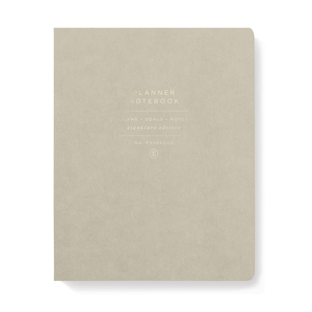 Non-dated weekly planner notebook with flexible kraft paperback cover featuring Fringe original artwork, metallic gold foil design, non-dated weekly planning grids, and lined notes pages.