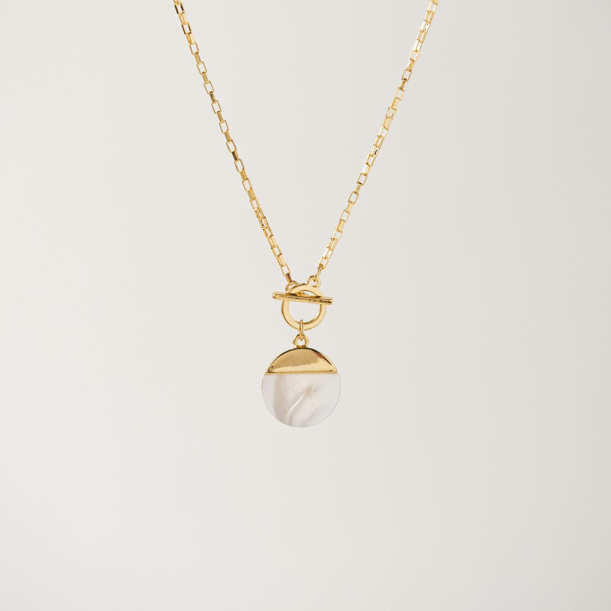 Delicate and natural Mother of Pearl pairs perfectly with gold-plated brass on the Oasis Toggle Necklace. The easy to use front toggle adds to the overall charm of this piece.