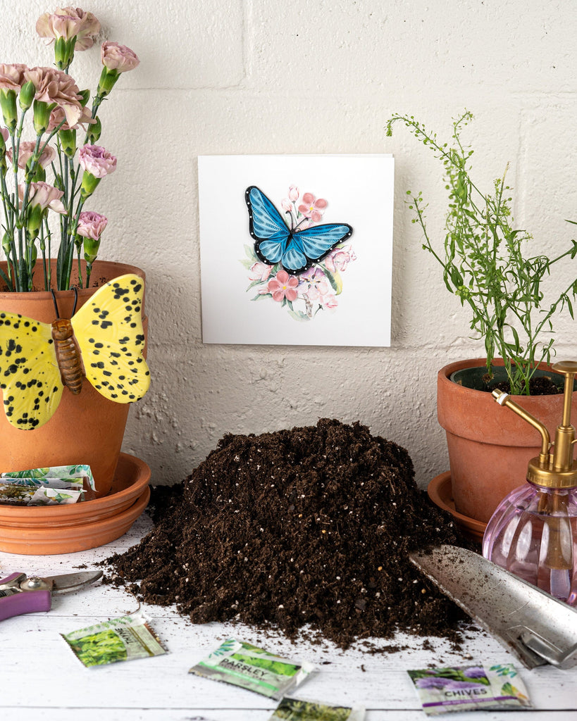 The handcrafted Blue Butterfly card is the perfect symbol of hope and life, the multiple shade of blue utilized makes the detail on the butterflies wings stand out. The butterfly is perched upon a watercolor painting of a pink spring flower. The quilled details make the Blue Butterfly design a thoughtful choice for a loved one you'd like to show support for.