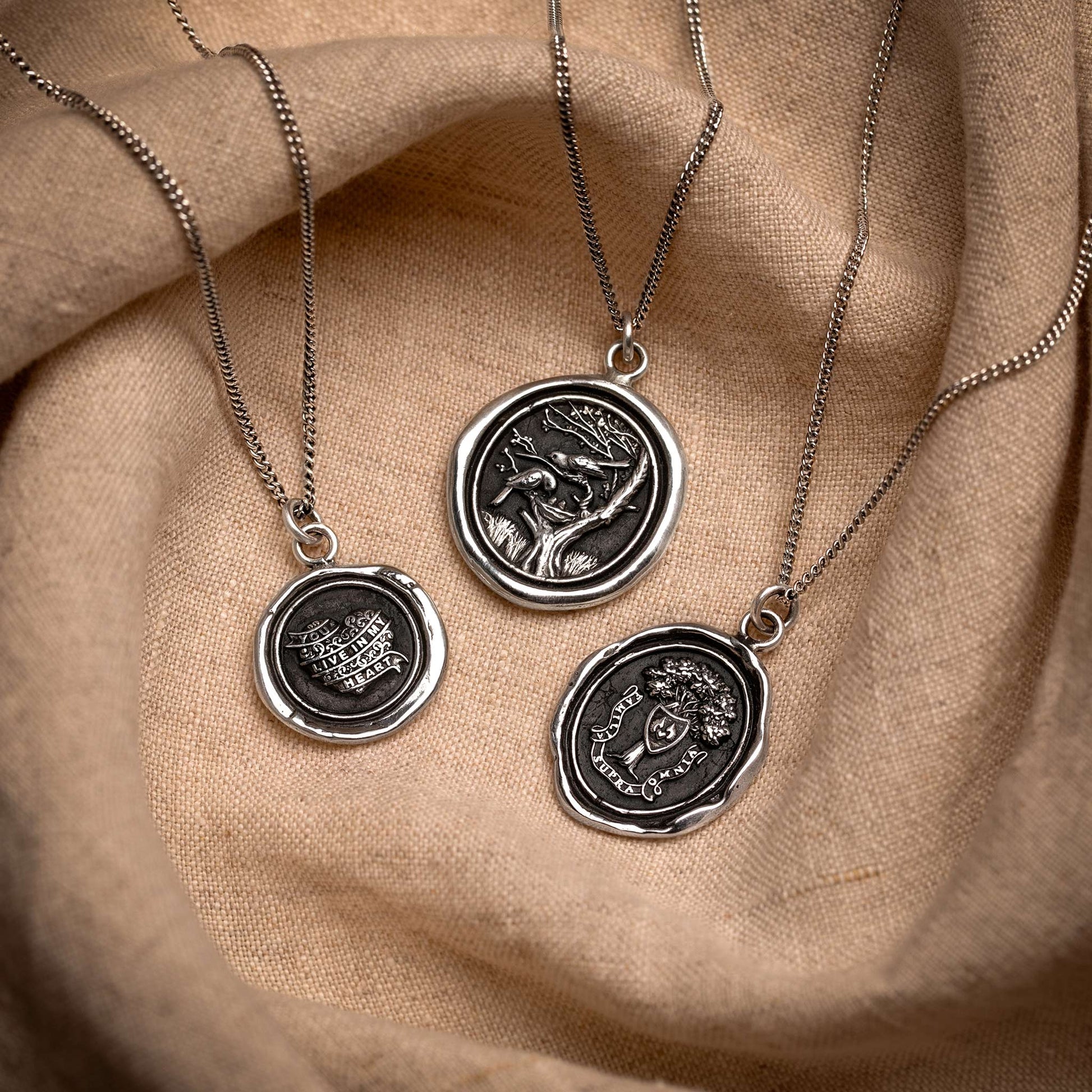 The ultimate expression of love, the ribbon-wrapped heart featured on this talisman reads 'You Live in My Heart.' It tells our loved ones that even when they aren't physically present, we carry them with us.